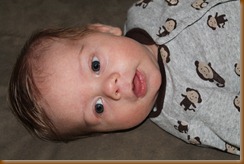 He’s definitely a mellow, patient, kid, and always smiling and talking to me. He is starting to like his bouncer seat and talks to the animals on that all the time now. We moved him to his own room at about 5 weeks, and he started sleeping through the night at 6 weeks.